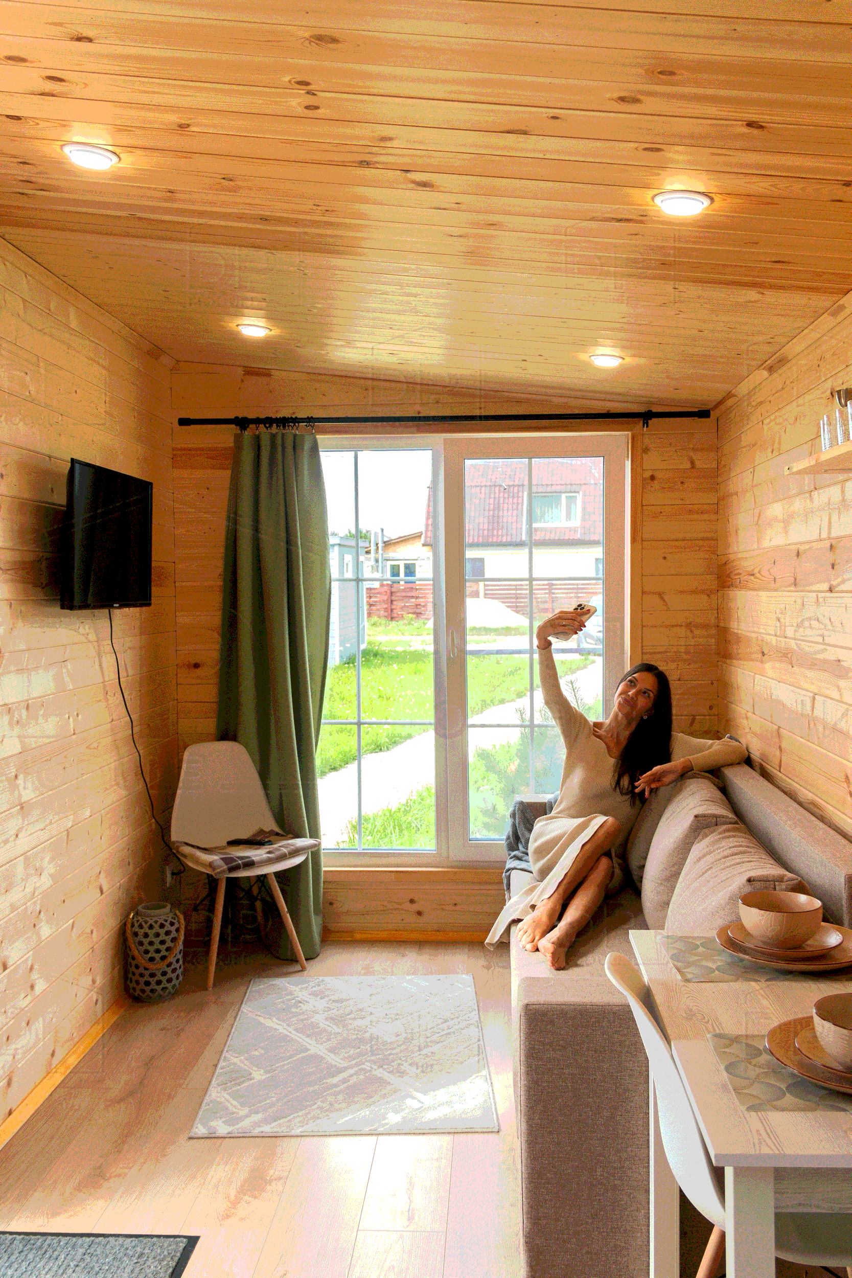 Внутри — имитация бруса, создающая уют и атмосферу настоящего деревянного дома.