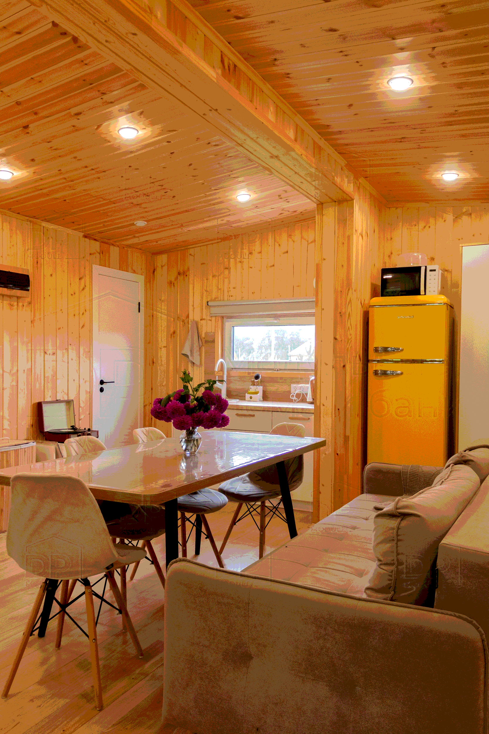 Дом от DP-module имеет прочный деревянный каркас из доски камерной сушки (50×150 мм и 50×100 мм), утепление KNAUF (100 мм по периметру и 150 мм в полу и потолке), надёжную паро- и ветровлагозащиту, а также внешнюю и внутреннюю отделку из имитации бруса.
